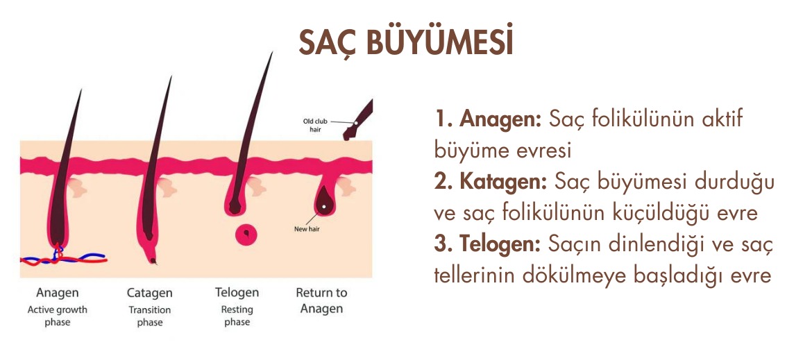 Bir saç kökü ömür boyunca 10-20 defa kendisini yineleyerek 2-5 yıl süren sikluslar halinde saç büyüme-dökülme evresine girer. Her seferinde yeni saçlar çıkar. Ancak bizler bu döngüyü genellikle fark edemeyiz. 2-5 yıllık dönemler boyunca bir saç teli 3 aşamadan geçerek doğar, büyür ve dökülür. Saç büyümesinin bu üç farklı aşaması:
